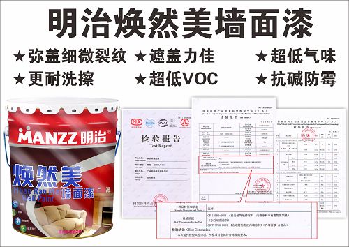 明治焕然美墙面漆是一款特别为家庭、公共场所设计的高档内墙墙面漆。它具有白度高、手感细腻、漆面光滑平整、耐洗擦、优质防霉、高遮盖力、施工便捷等诸多优良特点;而且它气味清新。不含有害物质,即使在施工过程中或进入刚粉刷过的房间,也不会对您的健康有任何损害,更进一步呵护您家人的健康成长。