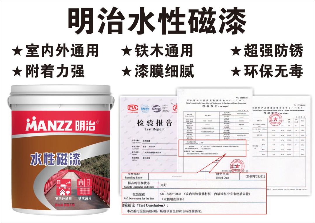 明治水性磁漆是一款铁木通用的新型环保水性涂料,漆膜能抵御天气及环境侵蚀,对室内外铁木件提供卓越的保护。具有水性环保,柔韧坚固,光泽饱满持久,美观耐用以及可调配多种色彩等特点。同时以清水调漆代替传统有机溶剂,净味环境,4小时即可重涂,施工简单。适用于门窗、暖气片、护栏等便面的保护和装饰作用。