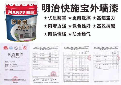 明治快施宝外墙漆是一款特别为家庭、公共场所外墙装修而采用全新配方设计的高品质外墙漆,它具有手感细腻、漆面光滑平整,优质防霉、耐候性好、高遮盖力、施工便捷等诸多优良特点;而且它气味清新,还可以持久地保护您的墙面,不含有害物质。即使在施工过程中,不会威胁到您的健康。