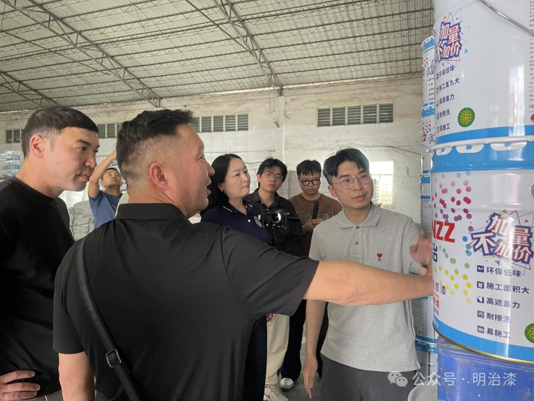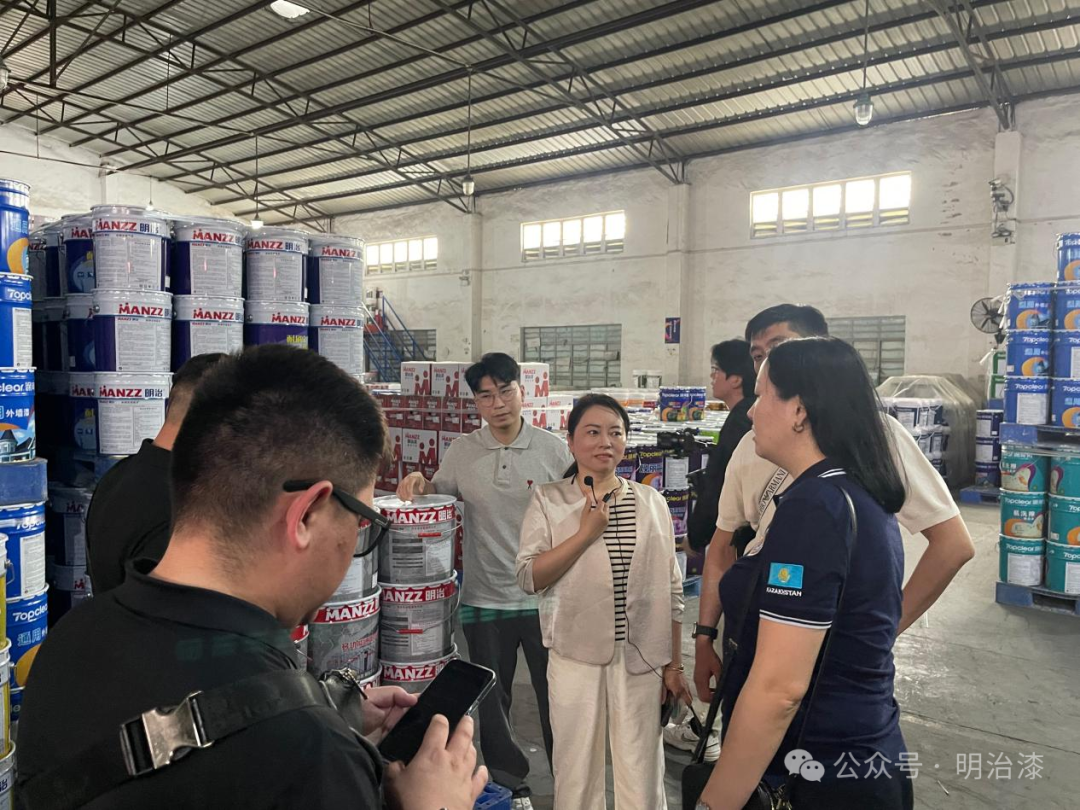 哈萨克斯坦BI GROUP集团一行先后参观了我司生产车间、成品及原料等仓库、产品研发实验室、艺术涂料展厅等。在技术应用廖主管讲解下,了解了我司厂区的各类生产产品具体情况。