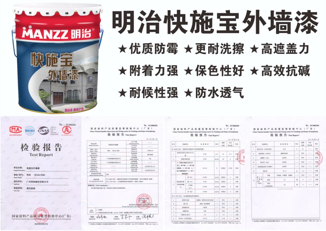 明治快施宝外墙漆是一款特别为家庭、公共场所外墙装修而采用全新配方设计的高品质外墙漆,它具有手感细腻、漆面光滑平整,优质防霉、耐候性好、高遮盖力、施工便捷等诸多优良特点;而且它气味清新,还可以持久地保护您的墙面,不含有害物质。即使在施工过程中,不会威胁到您的健康。