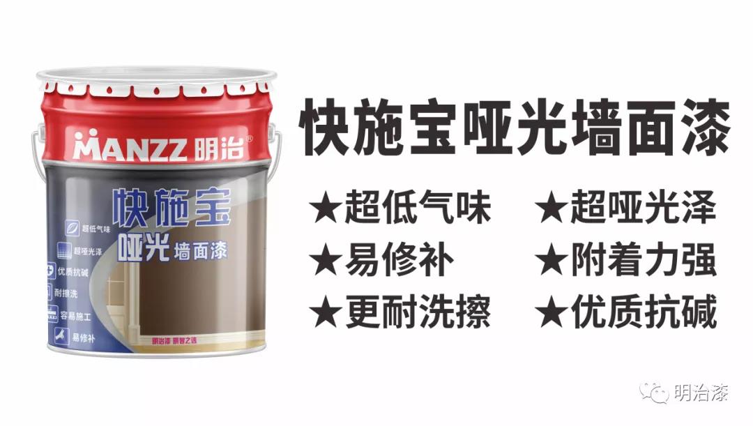 明治快施宝哑光墙面漆是采用哑光配方和先进的生产工艺精制而成的内墙漆,本产品结合耐洗擦配方,能够在漆膜表面形成独特保护层,漆膜坚硬,而且具有遮盖力强、附着力强等性能,能有效的覆盖底材,涂刷面积大,施工便捷,性价比高,配合超哑光泽不眩光,不刺眼,给您清新典雅的墙面效果。